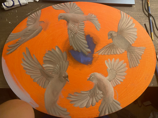 So far I have worked mostly on the underpainting for the birds and have begun to add color into the background. Going forward I plan to add color to the birds as well and possibly add more birds into the peice to give it some more depth. I had previously planned to accomplish that with flowers/leaves/branches, and had begun to paint a flower, however I think I will swap this idea out for the birds. I also think I will plan on adding more dramatic lighting and value to the birds currently.